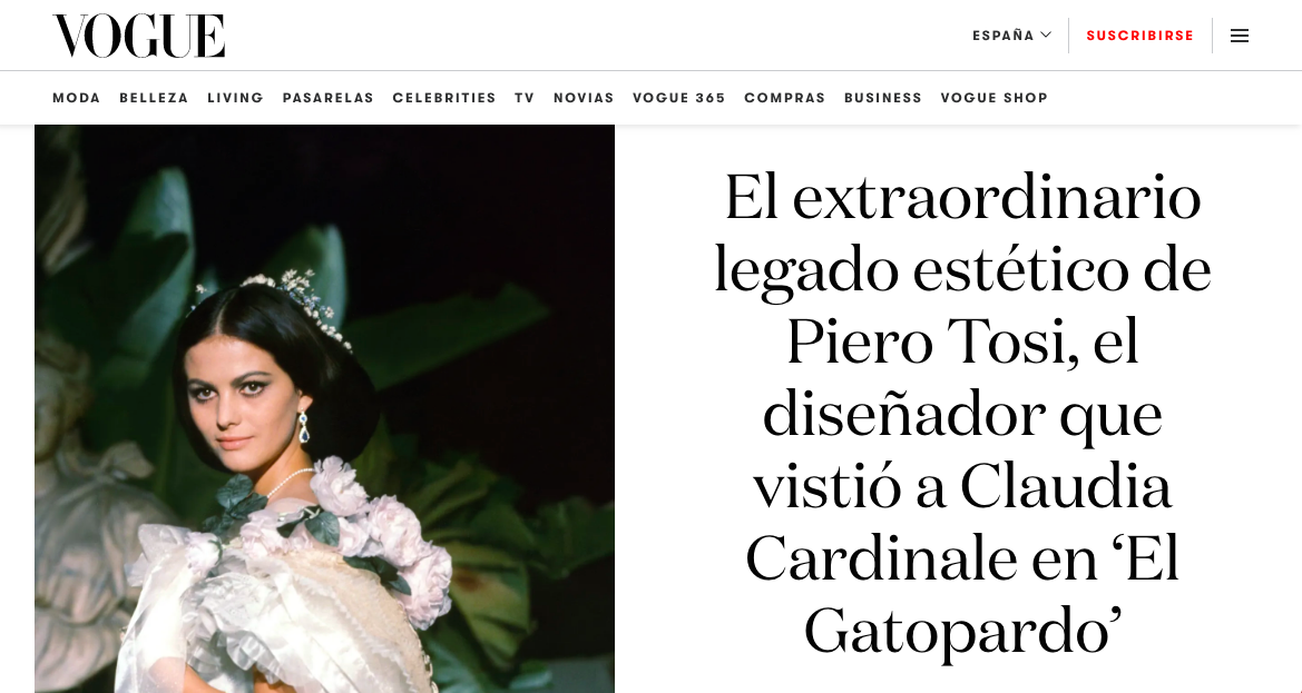 «El extraordinario legado estético de Piero Tosi, el diseñador que vistió a Claudia Cardinale en ‘El Gatopardo’«. Artículo homenaje a Piero Tosi. Vogue España (2021).
