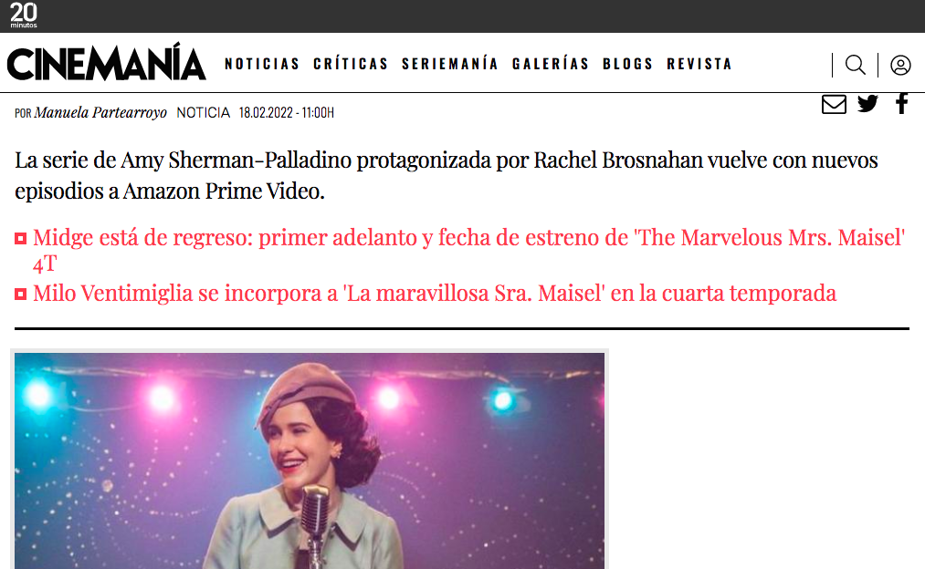 «‘La maravillosa Sra. Maisel’ vuelve a ser maravillosa en su temporada 4«. Artículo sobre la nueva temporada de La maravillosa Sra. Maisel. Revista Cinemanía, 20 Minutos (2022).
