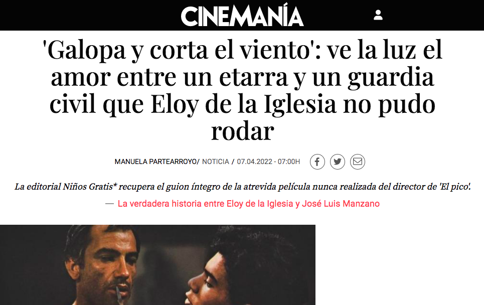 «‘Galopa y corta el viento’: ve la luz el amor entre un etarra y un guardia civil que Eloy de la Iglesia no pudo rodar«. Cinemanía (2022).